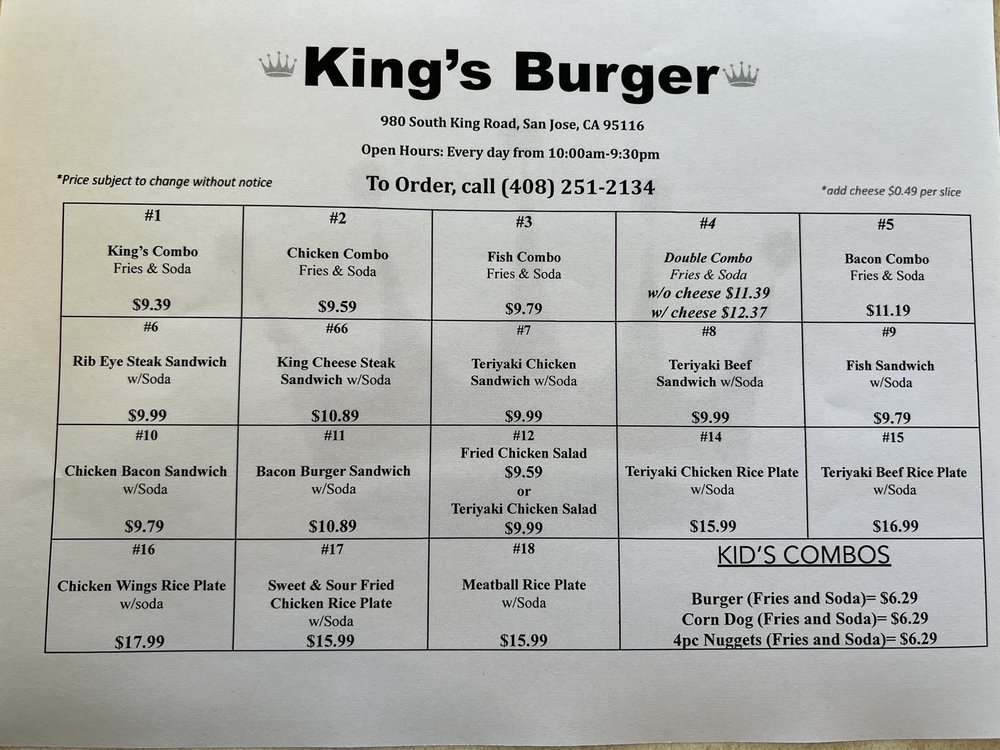 Welcome to King’s Burger House, where every bite is a royal delight! Nestled in the heart of San Jose at 980 S King Rd, this burger haven promises a feast for all burger lovers. The menu showcases a variety of handcrafted burgers, each made with fresh ingredients and a unique twist that sets them apart from the rest.